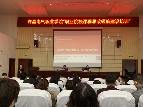 为推进我院课程思政建设,提升教师开展课程思政建设的意识和能力,确保立德树人的成效,3月20日,上海大学教务处副处长顾晓英教授应邀来我院进行了主题为“课程思政领航建设”的专题培训。院长杨德岭,副院长刘涛、冯朝印,纪委书记张明慧出席,全院中层干部、专兼职教师及辅导员参加了本次培训。培训会由教务处处长朱焕芝主持。