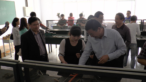 杨德岭院长(前排中)陪同许昌学院的领导参观我院汽车维修专业实训设备
