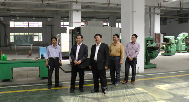 省教育工会主席李新江(左二)与杨德岭院长(左三)在学院实训车间
