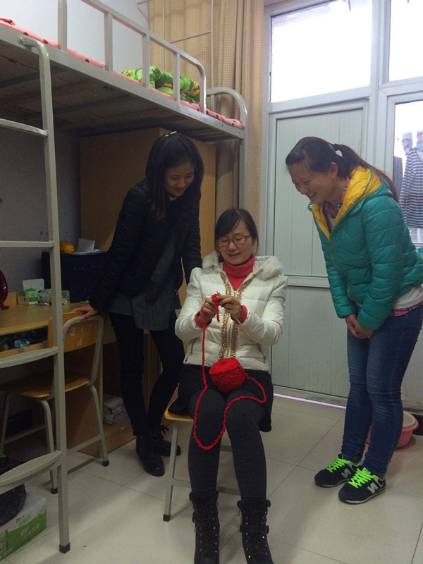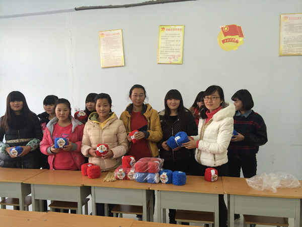 院团委负责人杨红培给学生发爱心毛线
