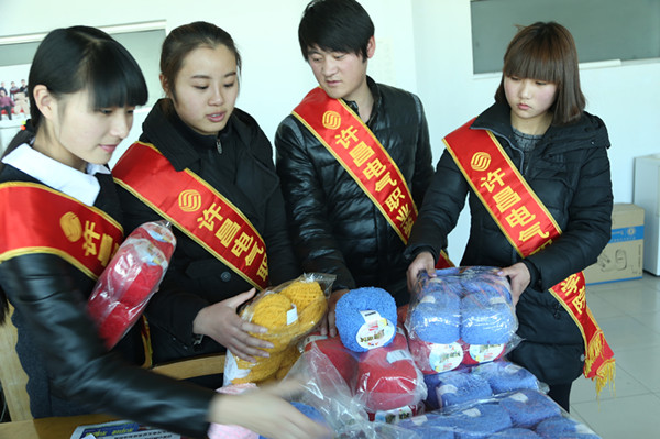 学生代表到许昌晨报社区新闻部领到第二批爱心毛线