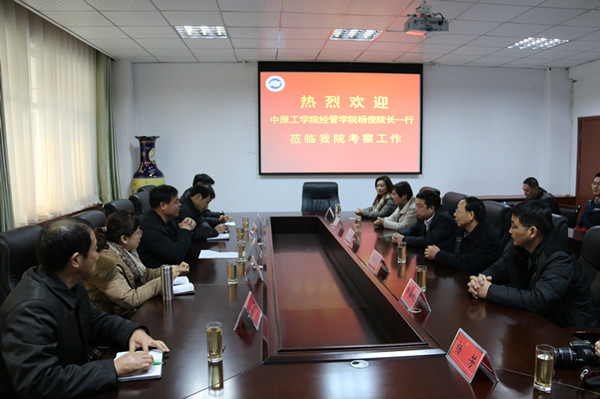 2015年1月8日下午,中原工学院经管学院副院长杨俊博士、国际教育学院副院长李宗民、会计系主任余黎峰,许昌学院经管学院院长周颖杰、党总支书记郭海清及中原工学院经管专业研究生一行16人莅临我院考察指导工作。院长杨德岭热情接待了客人。院办负责人鲁金惠、招生就业处负责人吕惠珠、经济管理系负责人押松海、宁博等陪同。