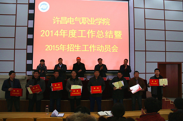 会议表彰了2014年度学院招生工作先进个人。院领导刘海峰宣读了《许昌电气职业学院关于表彰2014年招生工作先进个人的决定》。与会领导为获奖的陈武等8人颁发了荣誉证书。