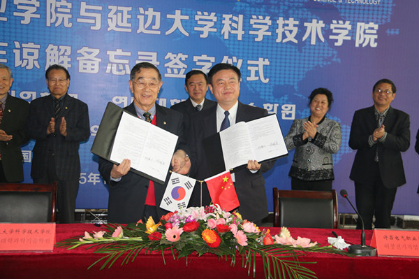 在热烈的掌声中,院长杨德岭代表我院与延边大学科学技术学院总长金镇庆分别在备忘录上签字。双方文本签署完毕后,签字人起立交换文本,握手致意,双方人员鼓掌祝贺。