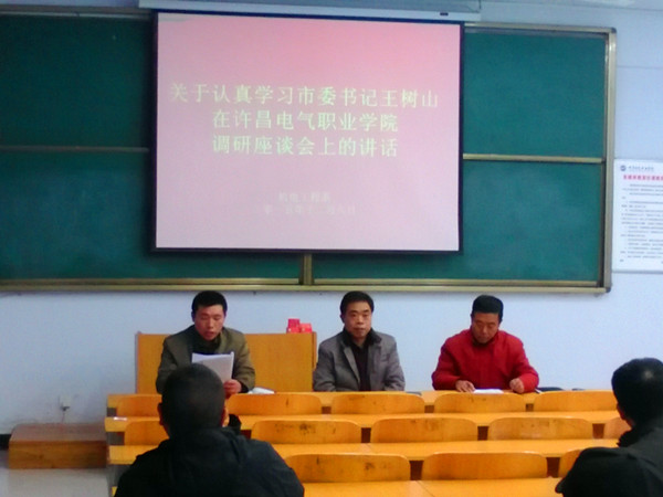 机电系负责人冯振华通告了12月4日许昌市委书记王树山来我院调研和召开座谈会的情况,宣读了王树山书记的讲话内容,传达了许昌市委市政府对我院的大力支持和殷切希望:下一步将尽快帮助我院进一步完善办学条件,进一步强化政策支撑,同时,也要求我们努力打造“电气”这个特色品牌,专业建设要更加贴近主导产业,要加强自身队伍建设及教学管理和学生管理。