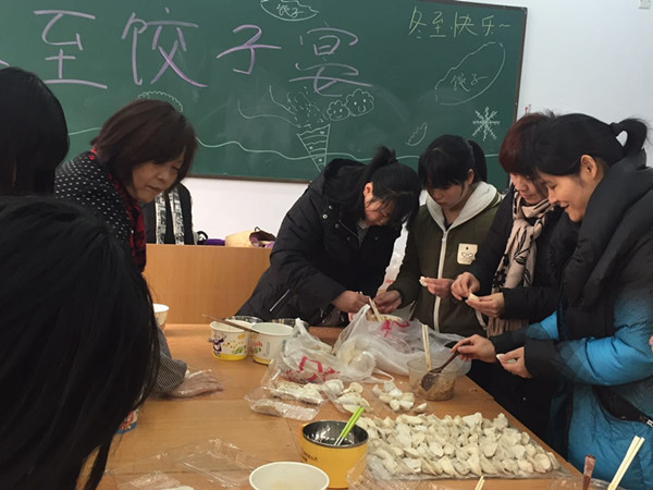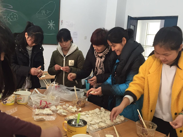 商淑敏副院长亲自到14级工业设计高职班和15级工业设计中职班陪学生们一起包饺子过冬至。艺术系两位负责人阎瑾瑜、董淑红提前准备好面团擀好饺子皮,以备大家使用。一下课学生们早早地整理好教室桌椅,摆放好厨具与食材,一个个跃跃欲试摩拳擦掌。尽管他们动作不太熟练,时不时地“创造”形态各异的饺子,但红扑扑的脸上都洋溢着亲自动手的愉悦笑靥。