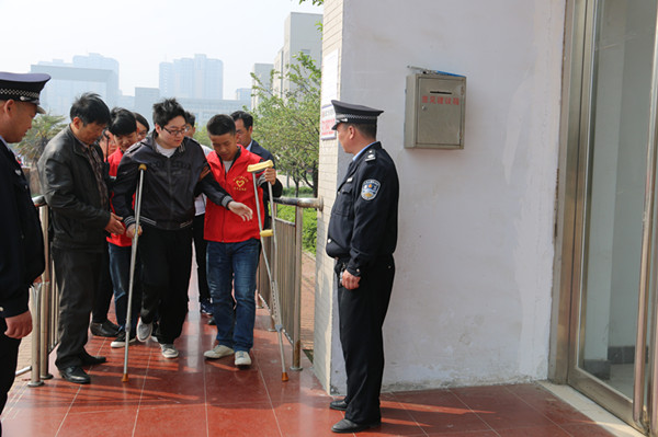 志愿者们帮助一名行动不便的考生进场