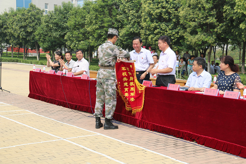 最后,杨鲁西书记和杨德岭院长代表学院向承训部队教官代表赠送了旌旗,感谢部队对学院军训工作的大力支持。