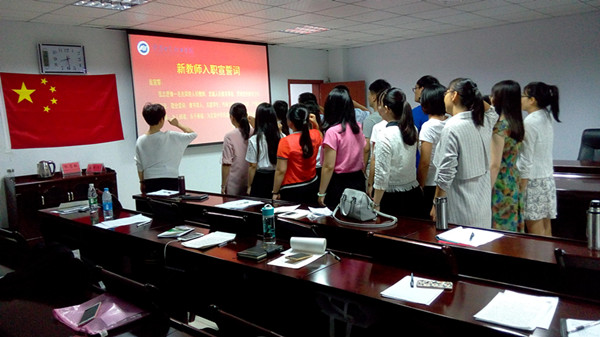 培训结束后,组织新教师举起右手,面对鲜艳的国旗,在学院公共教学部李保茹主任的带领下,进行了“我志愿做一名光荣的人民教师,忠诚人民教育事业,贯彻党的教育方针。爱国守法,敬业爱岗;教书育人,关爱学生;传承文明,勇于创新;严谨治学,启智求真;为人师表,乐于奉献。为实现中华民族的伟大复兴而努力奋斗!”的庄严宣誓,字正腔圆、铿锵有力。