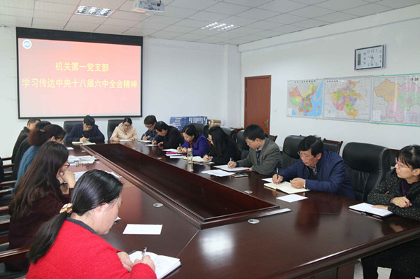 11月4日上午,机关第一党支部全体党员在行政楼第二会议室召开会议,学习传达十八届六中全会精神。