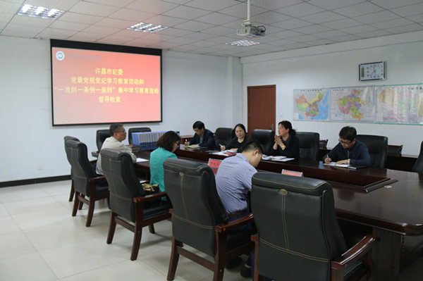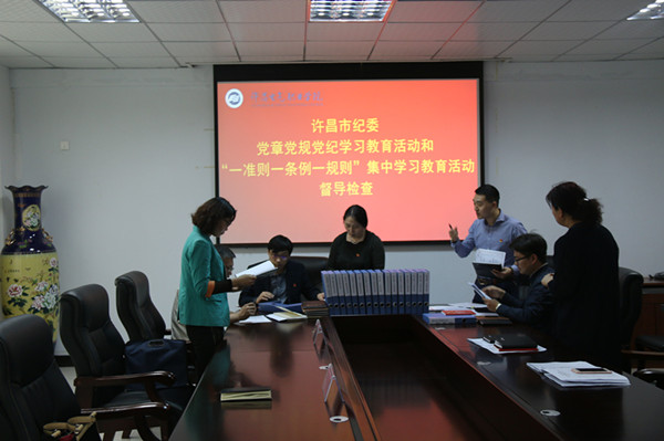 4月21日上午,许昌市纪委党章党规党纪及“一准则一条例一规则”集中学习教育活动第六督导组组长申建华,组员蔡文立、梁良一行三人莅临我院,对两项学习教育活动开展情况进行督导检查。党委委员,组宣部部长张明慧陪同。