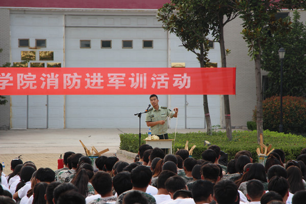 为全面落实省教育厅、省消防总队关于“消防进军训”精神,进一步增强师生防火安全意识,普及消防知识。9月15日15时整,学院保卫处、学生处利用新生军训间隙,组织2017年度新生,在学院广场举行了一次消防知识进军训活动。活动由保卫处负责人杨绍业主持,2017年度近3000名参训新生在军训教官和辅导员带领下参与活动。