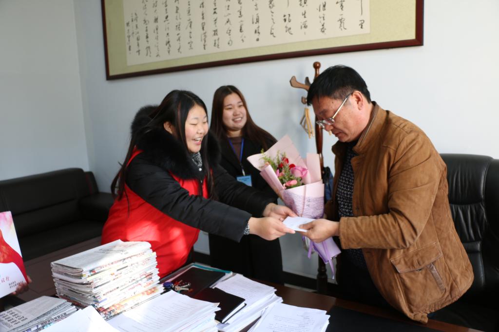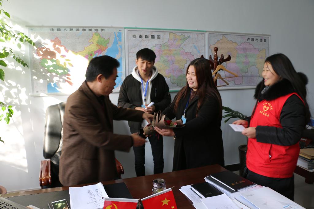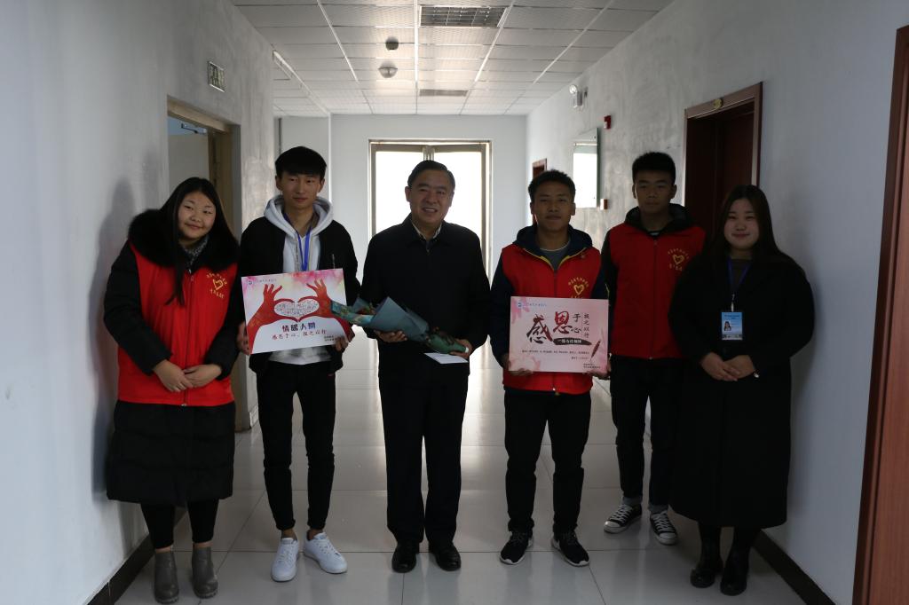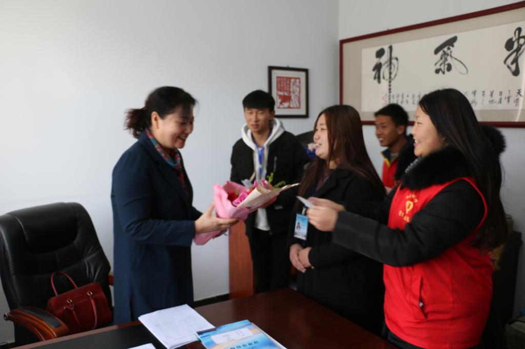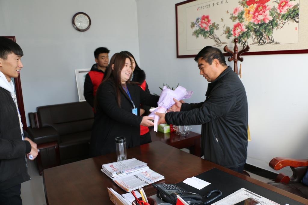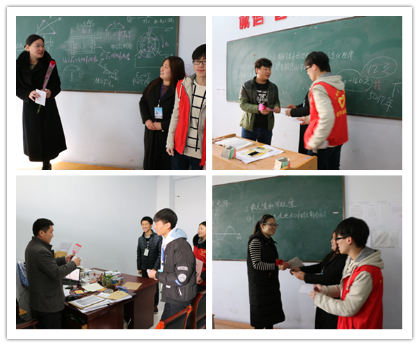 早上八点半由团委老师带领团干代表利用课间时间分别向学院党委书记杨鲁西,院长杨德岭,副院长商淑敏,副院长刘涛,副院长冯朝印,党委委员工会主席张勇,党委委员组宣部部长张明慧送以鲜花和最真挚的感恩祝福。