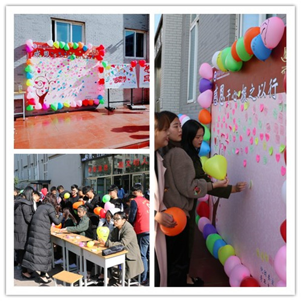 为深入开展“感恩教育”活动,引导每一位学生懂得感恩父母、感恩学校、感恩老师。11月23日上午,院团委组织号召,院团委会、青协主办的‘感恩于心,回报以行’的感恩节活动如期开展。