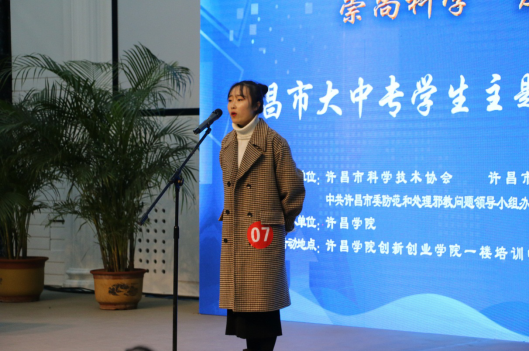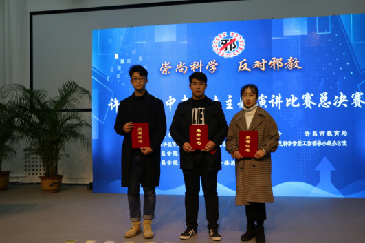 为进一步弘扬社会主义核心价值观,提高全民科学素养,推进反邪教警示教育和科普宣传活动的深入开展,不断提高学生识别和抵御邪教侵蚀的能力, 12月15日,由许昌市科学技术协会、许昌市反邪教协会、中共许昌市委防范和处理邪教问题领导小组办公室、许昌市全民科学素质工作领导小组办公室、许昌市教育局主办的许昌市大中专学生 “崇尚科学、反对邪教”主题演讲比赛总决赛于许昌学院创新创业学院一楼培训中心举行。我院党委委员、组织宣传统战部部长张明慧、团委书记杨红培出席本次比赛,公共教学部李宝茹主任应邀担任本次大赛评委。信息工程系孙一、艺术系李昀啸、王雅洁代表我院参加总决赛。