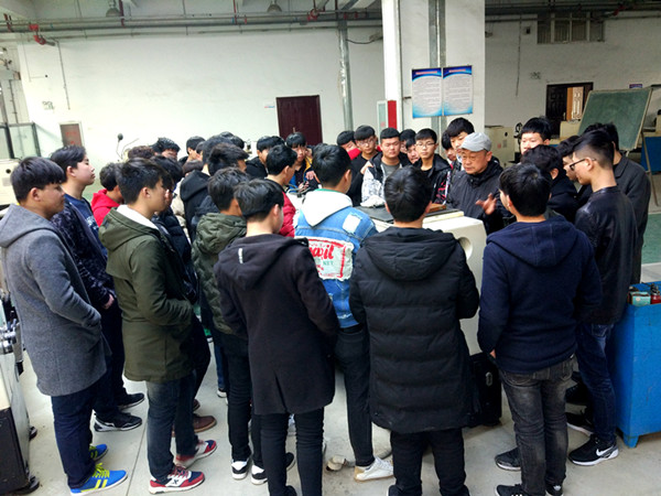 在实训楼,授课老师在实验设备前认真讲解设备的机械构造,工作原理,操作方法以及安全注意事项。学生们围绕在老师周围屏息凝神,认真听讲。