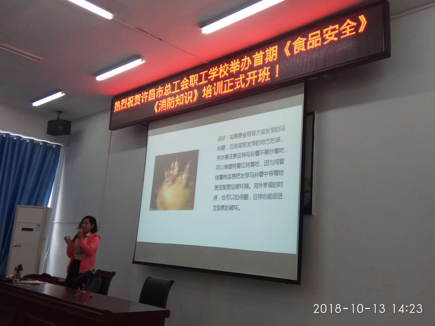 2018年10月13日、10月20日,后勤服务中心联合许昌市总工会职工学校对我院餐厅100多名人员进行了《食品安全》和《消防知识》培训。