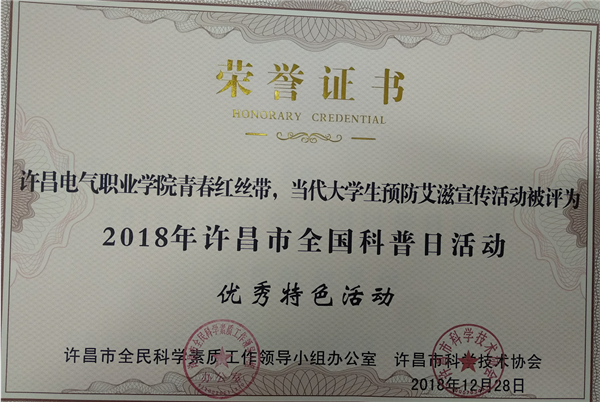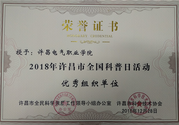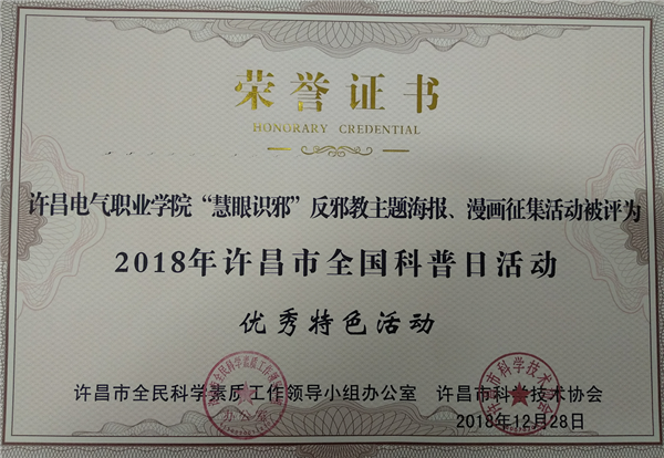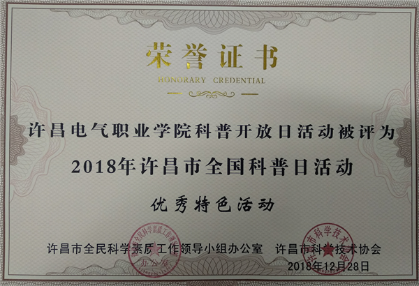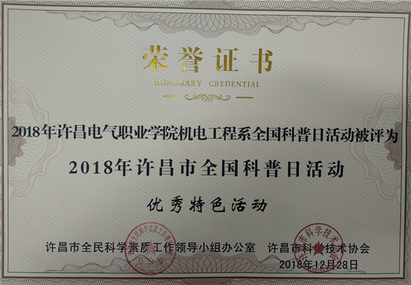 许昌电气职业学院全国科普日活动由学院科研外事中心、信息工程系、艺术系、机电工程系、经济管理系、电气工程系、学生处、团委联合开展,活动以“创新引领时代,智慧点亮生活”为主题,得到许昌市科协和广大科普爱好者好评。其中,由信息工程系主办的《青春红丝带,当代大学生预防艾滋病》、机电工程系主办的《绿色生活,美丽电院》、艺术系主办的《“慧眼识邪”反邪教主题海报、漫画征集》和科研外事中心主办的《科普开放日》等宣传活动被评为“2018年许昌市全国科普日优秀特色活动”,学生李昀啸参赛作品《科学,为万世开太平》荣获“2018年许昌市全国科普日活动优秀科普作品一等奖”,郭赟、陈晓红、武本令、王德真等四位教师荣获“2018年许昌市全国科普日活动优秀组织个人”。