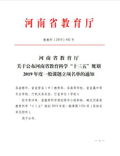 经专家小组评审、省教育科学规划办领导小组审核,确定我院申报课题:新时代高职学生科学素养提升策略及实践研究(课题编号:[2019]-JKGHYB-0571,主持人:商淑敏)、全媒体视域下提升高职学生思想政治理论课获得感的路径研究(课题编号:[2019]-JKGHYB-0572,主持人:宋贵斌)获河南省教育科学十三五规划2019年度一般立项课题。