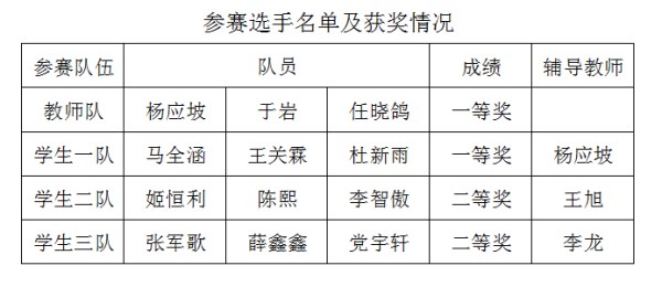 本次大赛由“线上个人挑战赛”和“线下分组对抗赛”两个环节组成。学院网络管理中心负责此次大赛的组织工作,网络管理中心、教务处和信息系的相关老师全程参与指导备赛、比赛工作。在近两个月的时间里,大家克服种种困难,加班加点,刻苦训练,认真备战,最终都取得了可喜的成绩。我院教师杨应坡、于岩、任晓鸽组成的许电院教师队获得一等奖。我院教师杨应坡辅导的许电院一队获得一等奖,教师王旭辅导的许电院二队、教师李龙辅导的许电院三队获得二等奖。