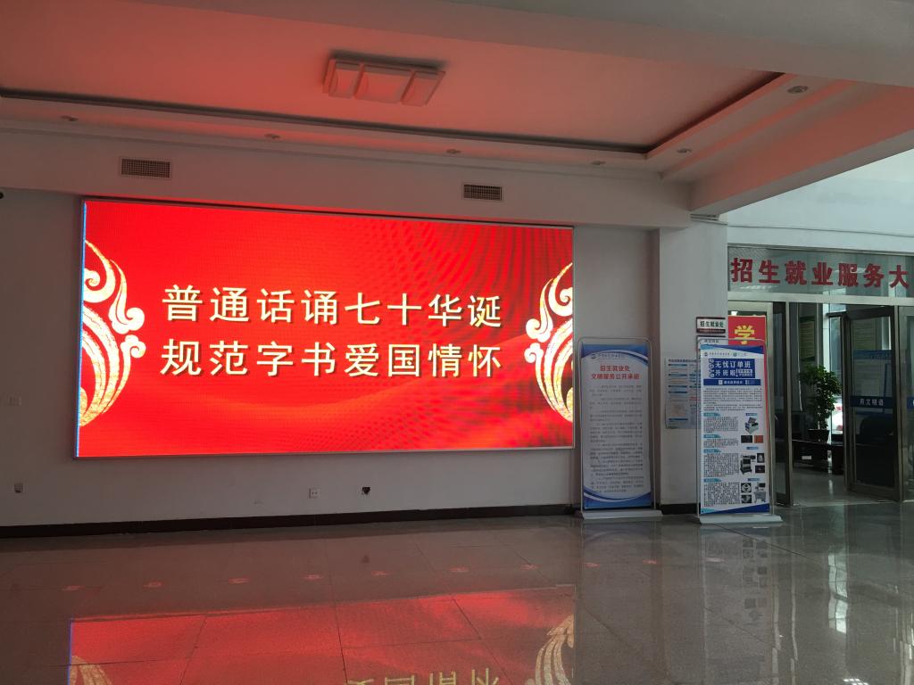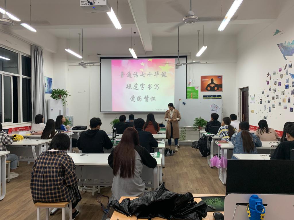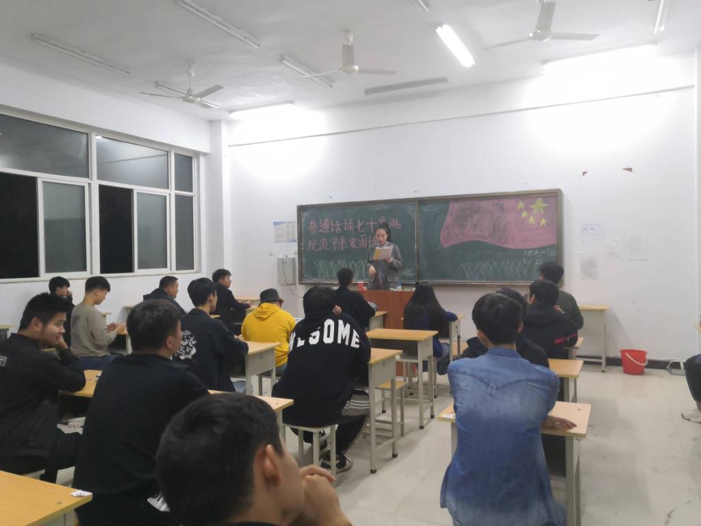 推普周期间,学院电子屏宣传“普通话诵七十华诞,规范字书爱国情怀”、“说好普通话,写好规范字”,张贴推普宣传图片,利用广播站向学生宣传普通话知识和祖国灿烂的文化,营造推广普通话、加强语言文字规范化的学习、生活环境。
