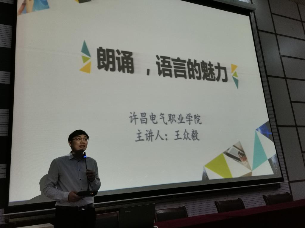19日下午,在一期报告厅举办了以《朗诵,语言的魅力》为主题的讲座,由王众毅老师主讲。王老师讲解普通话的渊源及有关朗诵的知识、技巧与情感的把握和调动。原本很专业的知识传授在深入浅出地示范讲解中让人轻松掌握。王老师在为同学们讲解知识点的同时,也进行了朗诵示范。一口流利准确的普通话和声情并茂的朗诵让同学们在他的引领下沉浸在朗诵的优美旋律中。在讲座的过程中,王老师热情的邀请了一些学生上台感受文字的艺术情操,感受朗诵的魅力。爱上朗诵,净化的是心灵,美丽的是语言。在这样热情洋溢的氛围中,同学们都不由自主的融入了他的课堂。
