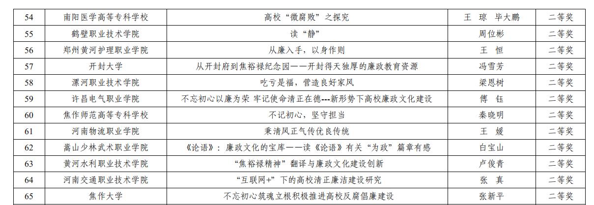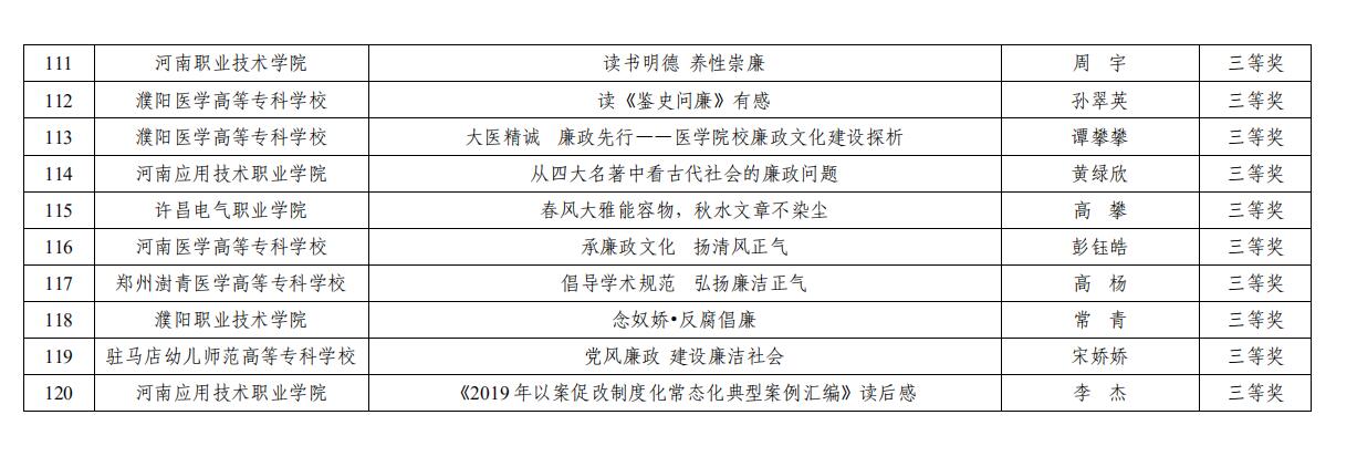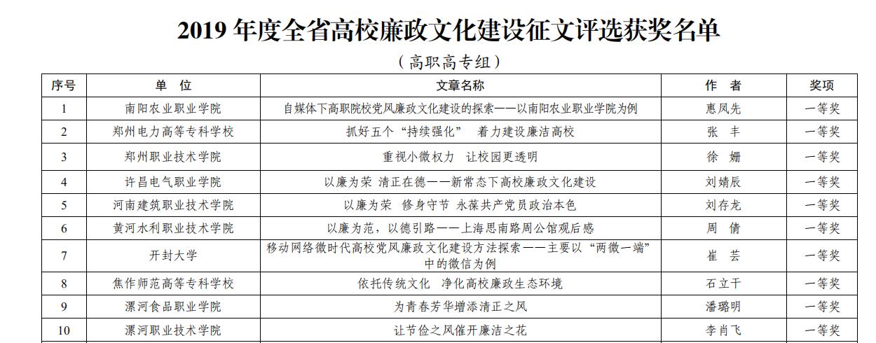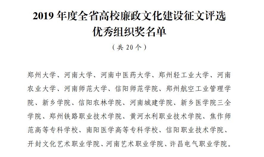 近日,中共河南省委高校工委、河南省教育厅下发了《关于公布2019年度全省高校廉政文化建设征文活动评选结果的通知》(豫高发〔2019〕65号),我院报送的作品在这次征文评选活动中分别获得一、二、三等奖,并在全省本专科院校评出20个优秀组织奖,我院为获奖单位之一。