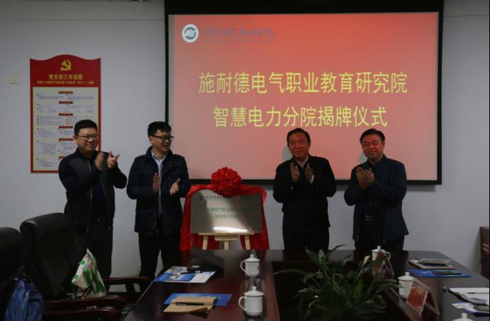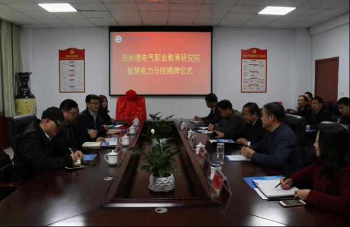 为加快学院电气专业现代化发展,在河南省人力资源社会保障厅——法国施耐德(中国)电气“碧波计划”战略框架引领下,经过前期充分对接,11月20日上午,许昌电气职业学院与法国施耐德电气携手共建的“施耐德电气职业教育研究院智慧电力分院”在我院正式揭牌成立。河南省人力资源与社会保障厅职业能力建设处主任武化雨,施耐德电气公司职业教育项目总监梁健、总经理杨勇,学院党委书记杨鲁西、院长杨德岭、副院长冯朝印及办公室主任胡晓敏、教务处长朱焕芝等出席揭牌仪式。