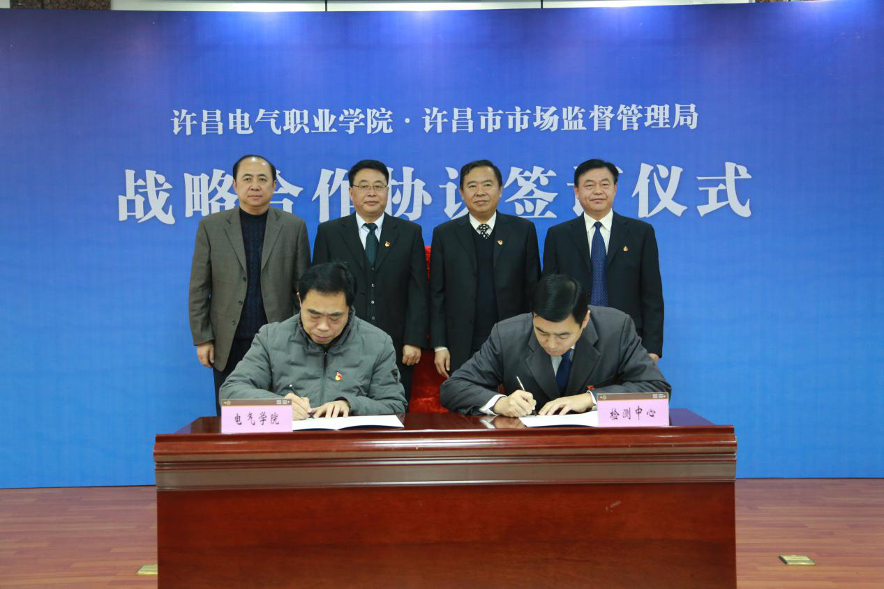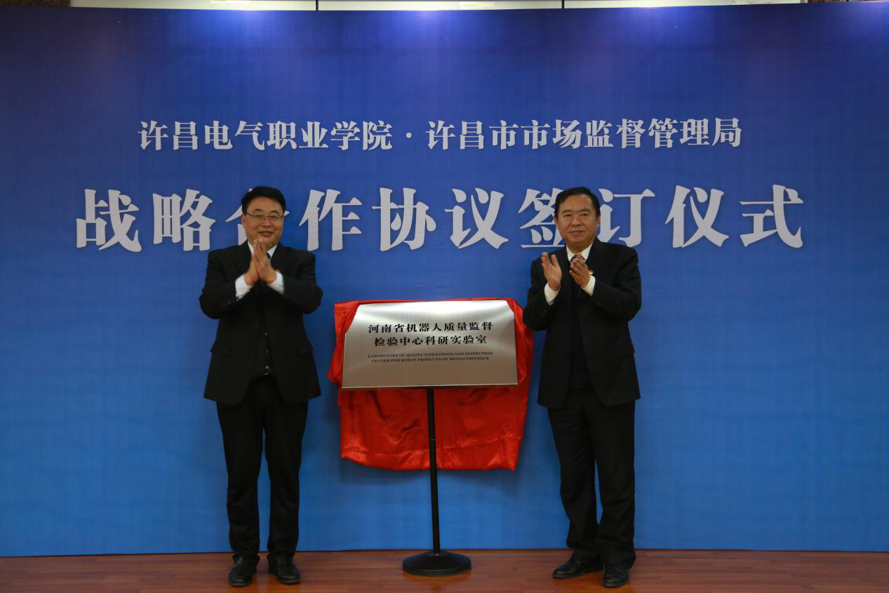 为加强校政融合,实现优势互补,合作共赢,共同推进我市人才培养和检验检测产业集群建设,1月17日上午,我院与许昌市市场监督管理局战略合作签约仪式在市场监督管理局会议室举行。学院党委书记杨鲁西、院长杨德岭、副院长冯朝印,许昌市市场监督管理局局长田德海、副局长单向东,检测中心主任陈卫哲等出席签约仪式,并共同为设在我院的“河南省机器人质量监督检验测试中心科研实验室”揭牌。