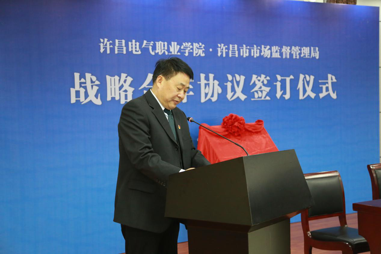 院长杨德岭首先介绍了我院的发展概况,指出许昌市市场监督管理局质量技术监督检验测试中心拥有陶瓷、发制品2个国家质检中心及电机、漆包线、机器人、不锈钢、淀粉制品及豆制品、蜂产品等若干个省质检中心,初步形成了国家、省检验检测中心产业集群,高端公共测试技术平台数量和综合能力遥居省内第一,并居中西部地市前列。我院工业机器人技术、电气自动化技术、机电一体化技术、电力系统继电保护与自动化技术与许昌市质量技术监督检验测试中心有着诸多的合作领域。此次与许昌市市场监督管理局建立战略合作关系,无疑是一项正确的抉择,必将对推进双方合作共赢,实现跨越式发展起到积极推动作用。