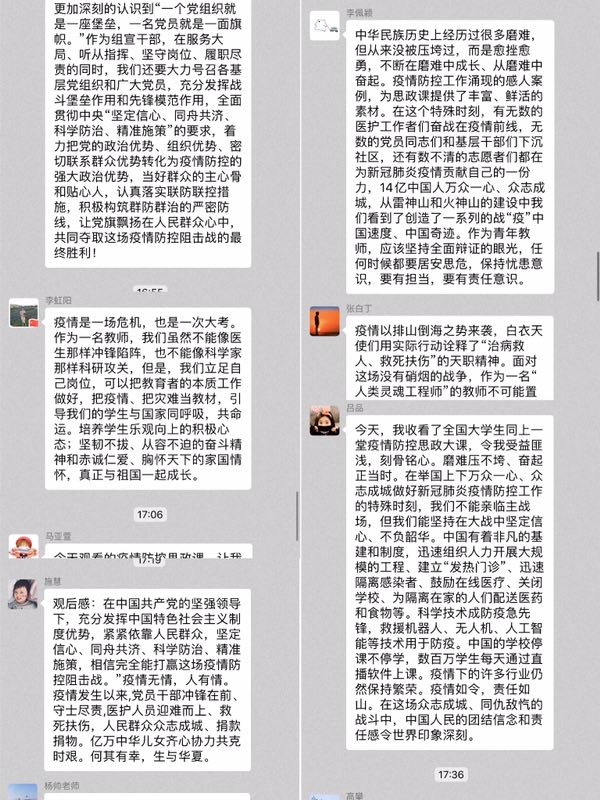 组宣部李冰:听了这堂生动形象的疫情防控思政大课,感慨万千。鼠年新春至今,我们打响了一场没有硝烟的战争,习近平总书记和党中央高度重视,迅速做出部署,采取有效措施,坚决遏制疫情蔓延势头。而今,千万个勇士奔赴前线,千万个平凡的普通人响应号召自我隔离,最终,疫情得到了有效控制。在这场生死较量的战役中,我们伟大的祖国,向世界交了一份满意的答卷。
