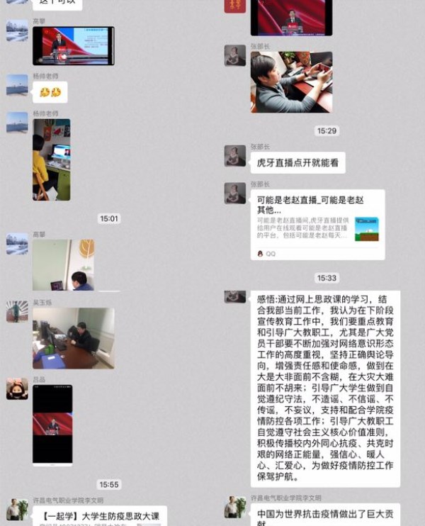 组宣部副部长张丽:通过网上思政课的学习,结合我部当前工作,我认为在下阶段宣传教育工作中,我们要重点教育和引导广大教职工,尤其是广大党员干部要不断加强对意识形态工作的高度重视,坚持正确舆论导向,增强责任感和使命感,做到在大是大非面前不含糊,在大灾大难面前不退缩;引导广大学生自觉遵纪守法,不造谣、不信谣、不传谣、不妄议,支持和配合学院疫情防控各项工作;引导广大教职工自觉遵守社会主义核心价值准则,积极传播校内外同心抗疫、共克时艰的正能量,强信心、暖人心、汇爱心,为学院疫情防控工作保驾护航。