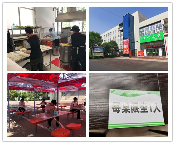学院对学生就餐问题考虑得也很周到。食堂餐桌上以“每桌一人”原则排列的餐位标识清晰可见。学院设置有室外就餐安排,提供套餐,提倡打包带走,许多学生就餐时按要求,排队将饭菜盛入自备的餐盒中,带回寝室食用。
