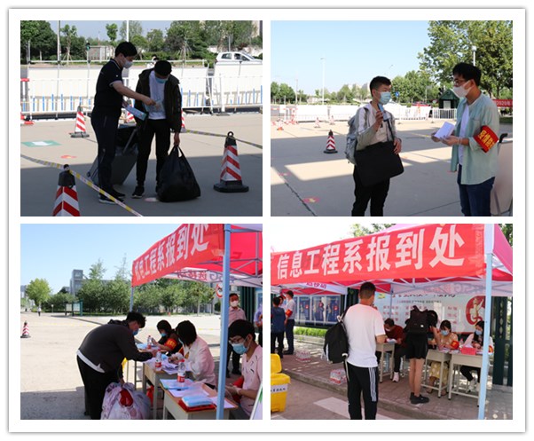 整个学生报到流程流畅科学。在机电工程系和信息工程系学生通道处,学生们按照间距1米以上的标准排队,向老师出示自己的健康码。各系的老师认真核实学生身份、健康码、行程记录等信息,回收学生的健康卡和健康承诺书,发放口罩和准予入校证明。学生按照指定路线返回宿舍,在宿舍门口接受第二次体温检测,行李消毒之后,方可办理入住手续。