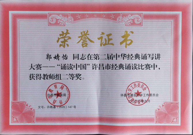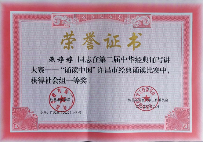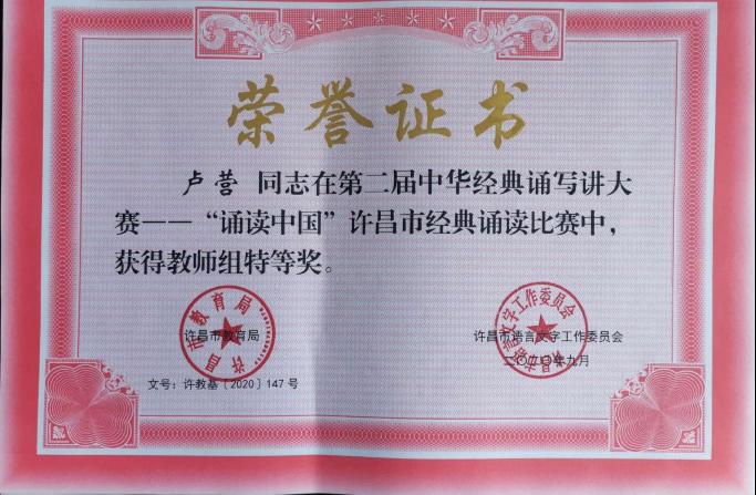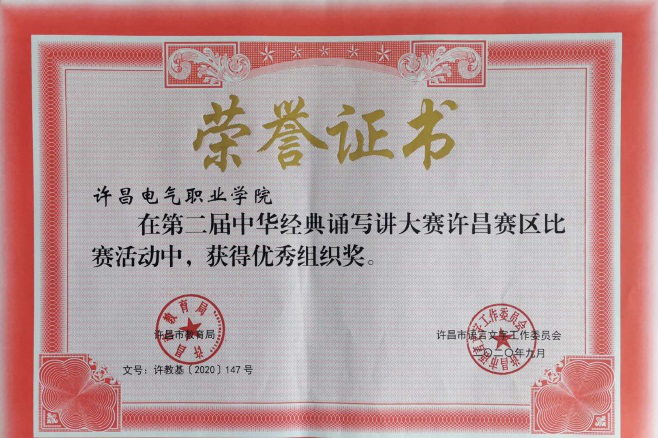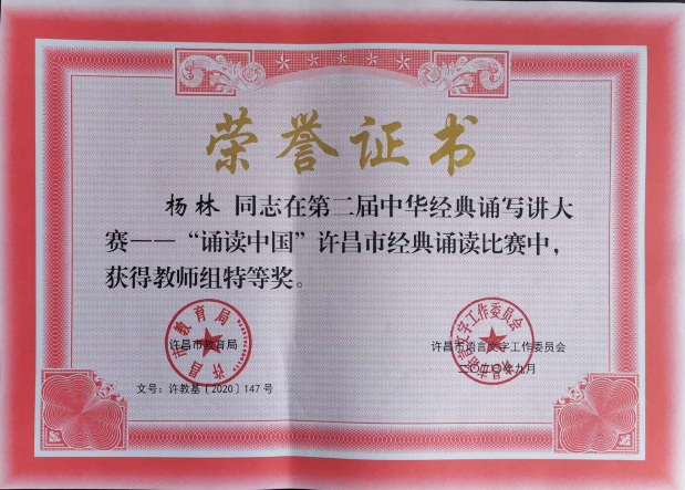 近日,从许昌市语委办获悉,在第二届中华经典诵写讲大赛——“诵读中国”许昌市经典诵读比赛中,学院荣获“优秀组织奖”。我院教师杨林、卢营的作品《屈原颂——生死交响》获教师组特等奖,并代表许昌地区入围河南省“诵读中国”教师组比赛;学生燕婷婷的作品《因为有你》获社会组一等奖;郭婧怡作品《我看见》获教师组二等奖。
