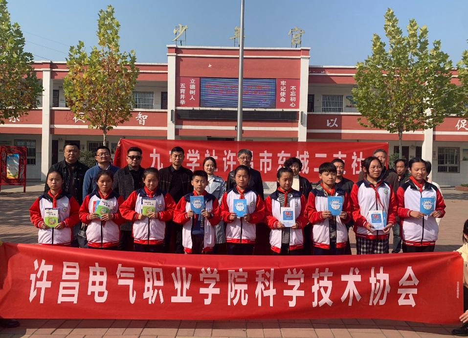 座谈结束后,九三学社许昌东城二支社与许昌电气职业学院科协联合募捐科普书籍400多本,少先队员们热情领取书籍并一起合影留念。