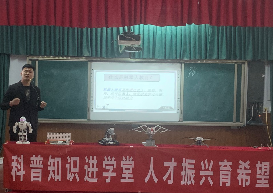下午,九三学社邀请了许昌能力风暴机器人教育学校云鼎校区校长陈焱及张博老师,开展“机器人教育”主题科普讲座。张博老师首先向同学们演示了智能机器人语音对话、舞蹈等,并围绕“什么是机器人”、“为什么要做机器人”、“机器人能够做什么”、“未来的机器人会是什么样子”等方面,以图文、视频的形式向同学们分享机器人的科普知识。他希望通过自己的科普讲座,能够让同学们有机会接触到这部分知识,从而激发他们的兴趣。同时,帮助孩子树立正确的科学价值观。