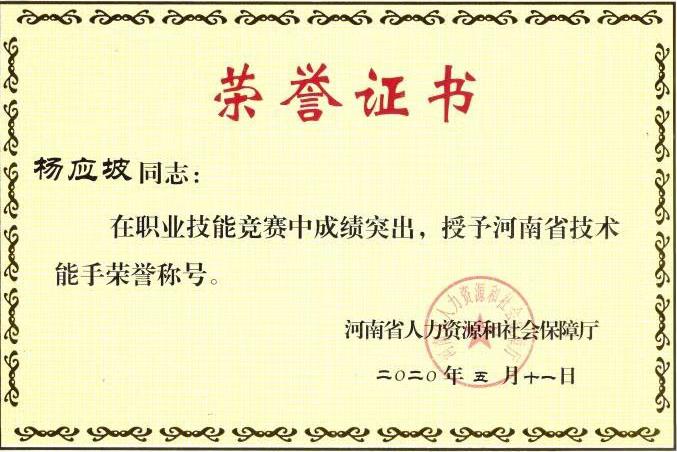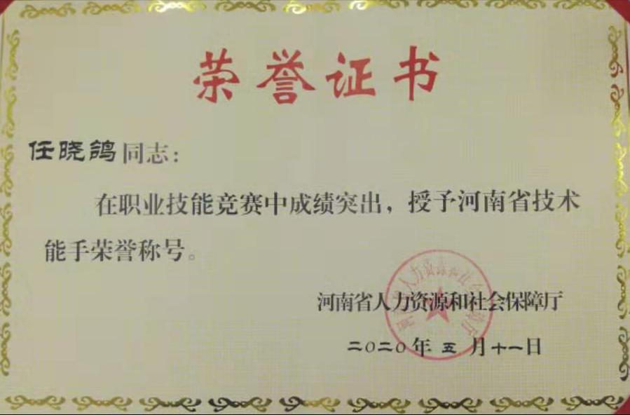 近日,从河南省人力资源和社会保障厅发布的《关于授予职业技能竞赛优秀选手河南省技术能手荣誉的决定》(豫人社函【2020】64号)获悉,我院杨应坡和任晓鸽2名教师,被河南省人力资源和社会保障厅授予“河南省技术能手”荣誉称号。