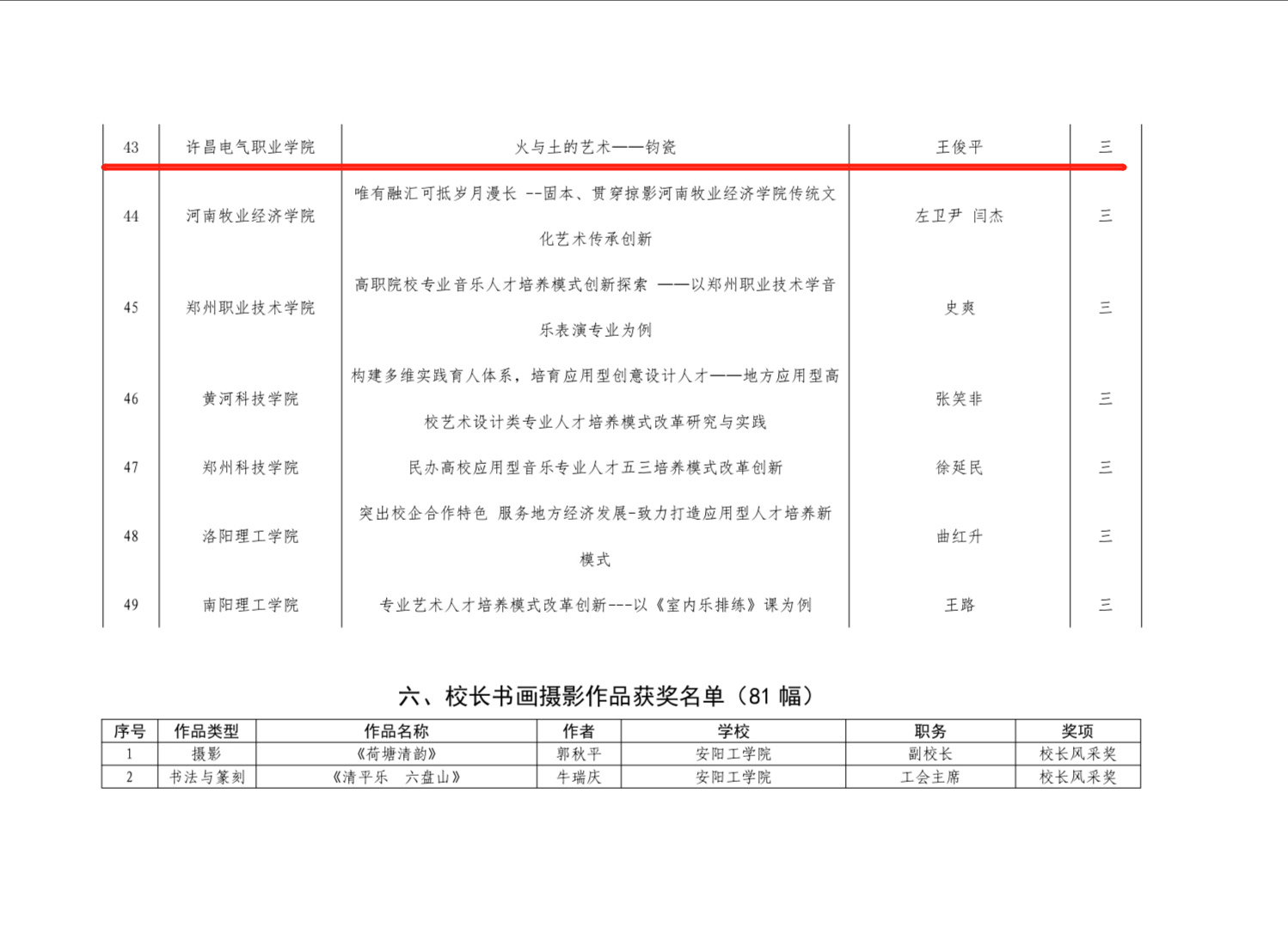 在艺术表演类节目中,器乐演奏《Yole(尤丽)》获得 二等奖,群舞 《春晓》获得三等奖,朗诵《我,向人民报道》获得三等奖。在高校美育改革创新优秀案例中,《火与土的艺术——钧瓷》获得三等奖。