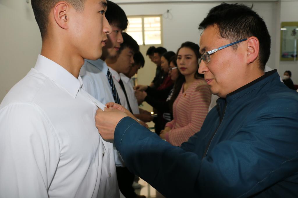 入团仪式在庄严的国歌声中拉开帷幕,主持人说明入团仪式的意义后,院团委杨红培书记和各系团总支书记为新团员代表佩戴团徽,并颁发团员证。