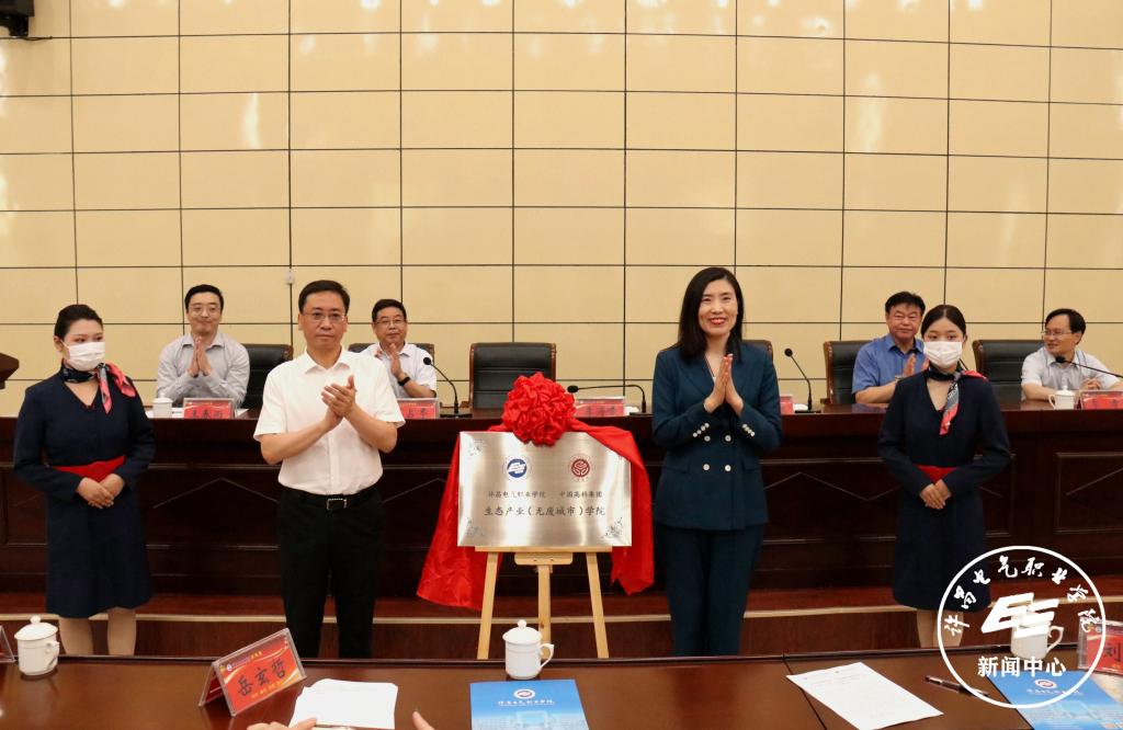 随后,在现场师生代表的共同见证下,许昌市人民政府副市长李海峰与中国高科集团总裁朱怡然共同为生态产业(无废城市)学院揭牌。