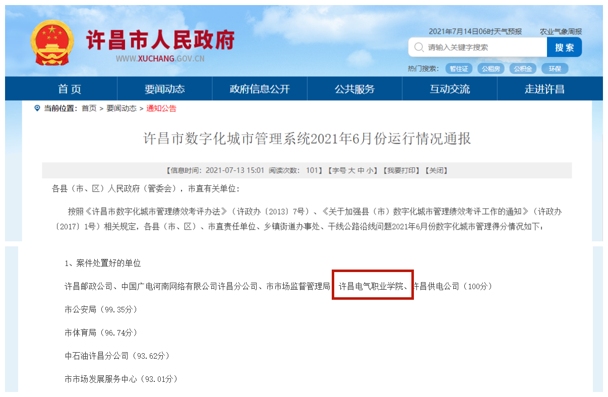 近日, 许昌市数字化城市管理中心按照《许昌市数字化城市管理绩效考评办法》等相关规定,通报了各县(市、区)、市直责任单位、乡镇街道办事处、干线公路沿线问题2021年6月份数字化城市管理得分情况,我院以评分100分的成绩,被评为许昌市数字化城管系统2021年6月份运行情况通报中案件处置好的单位。