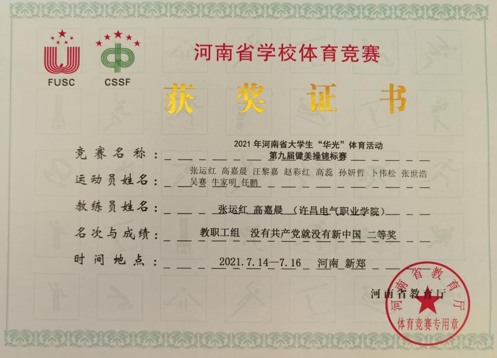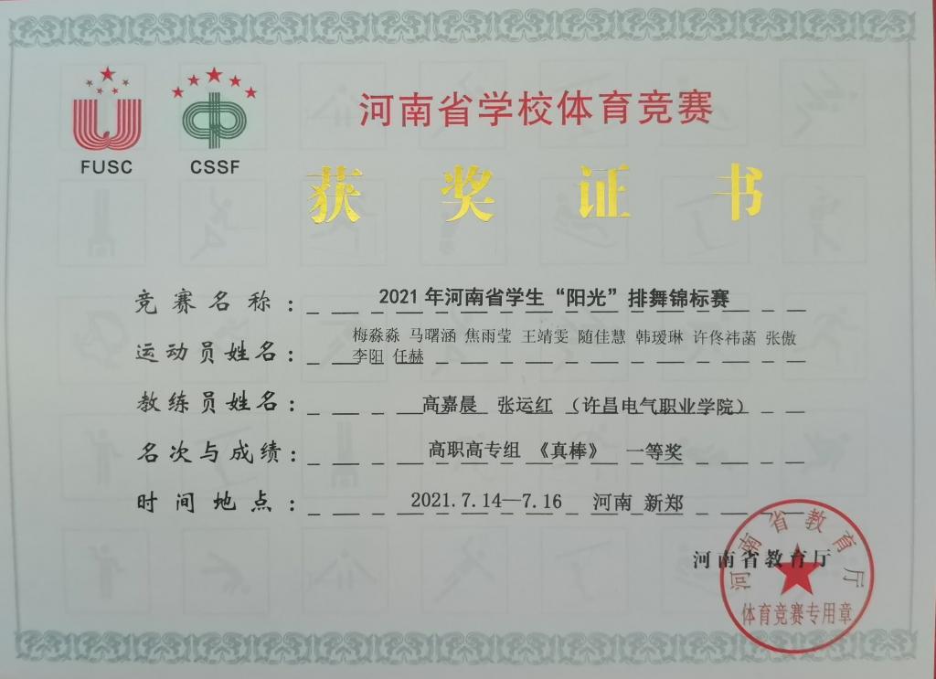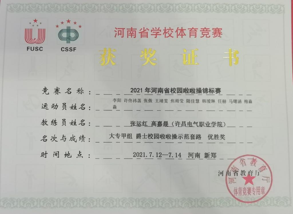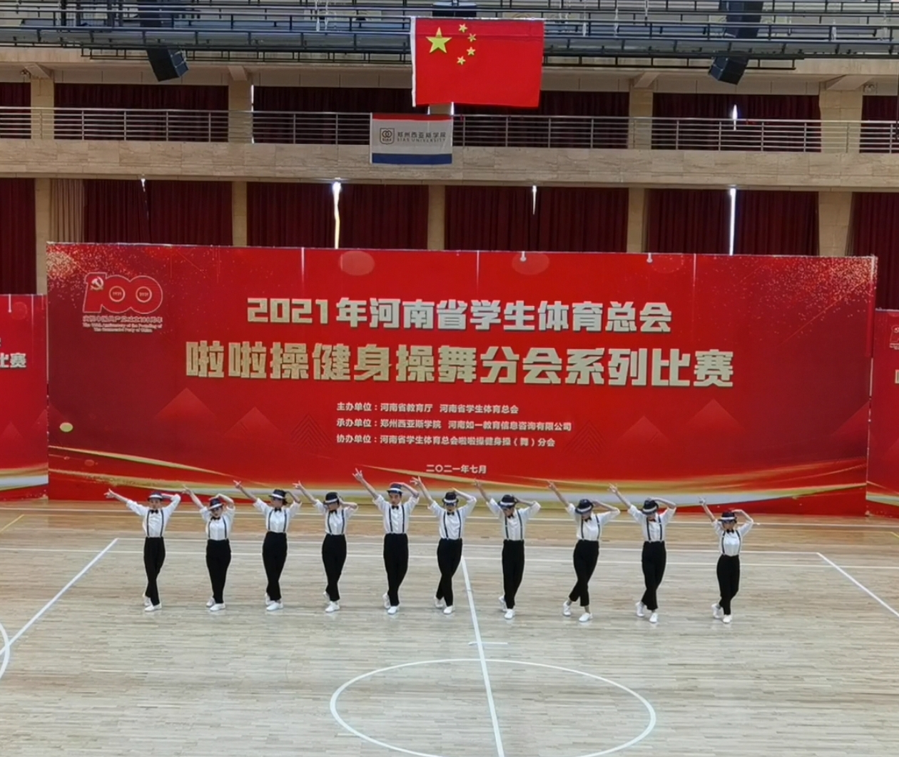 7月14-16日,由河南省教育厅主办的“2021年河南省啦啦操健身操舞系列比赛”在郑州西亚斯学院隆重举行。我院取得了排舞锦标赛高职高专组一等奖、健美操锦标赛教职工组二等奖、啦啦操锦标赛大专甲组优胜奖的好成绩。