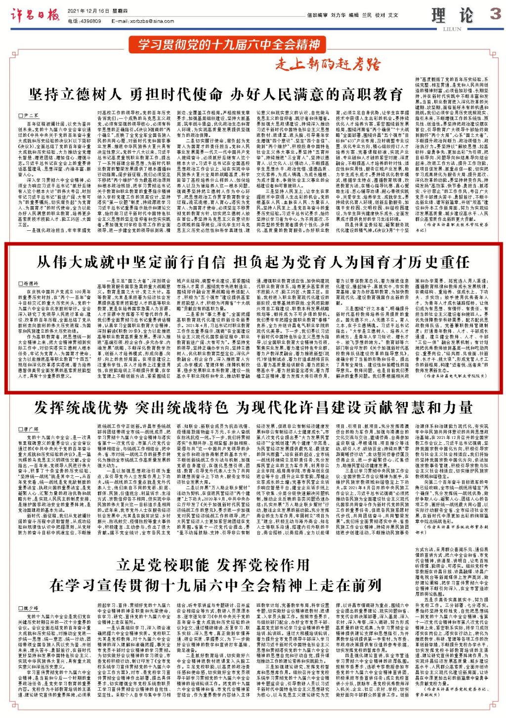 12月16日,《许昌日报》理论版刊发了我院院长杨德岭教授撰写的《从伟大成就中坚定前行自信 担负起为党育人为国育才历史重任》,全文转发如下:
