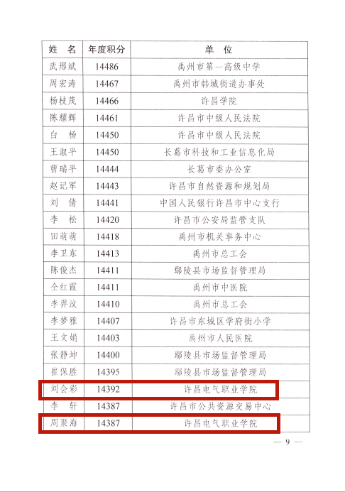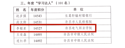 后勤管理与基建处周聚海、李根星和公共教学部刘会彩三位老师在许昌市寻找“学习强国”学习达人活动中,被评为年度“学习达人”;李佩颖被评为“优秀管理员”。