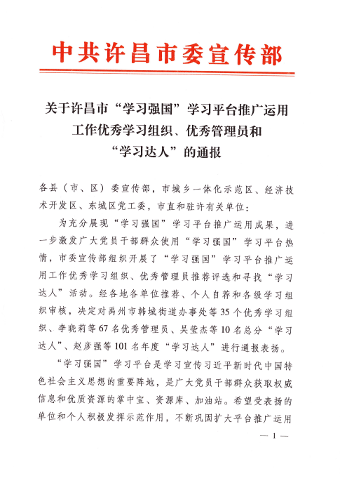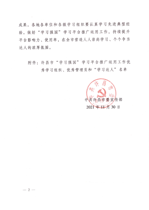 近日,学院“学习强国”工作再传喜讯,我院获评许昌市“学习强国”学习平台推广运用工作“优秀学习组织”称号。此次评选活动为全面落实省、市委部署要求,充分发挥“学习强国”学习典型示范带动作用,经由中共许昌市委宣传部审定,最终评选出2021年度“先进学习组织”。