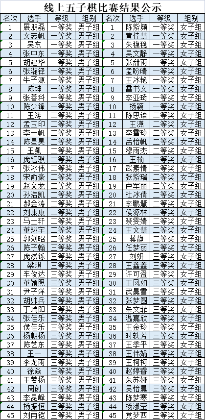 最终,根据参赛选手积分,最终展朋磊、陈紫颜等20名男子、女子选手获得本次比赛一等奖,王涛、陈思语等30名男子、女子选手获得本次比赛二等奖;陈子翰、任梦丽等40名男子、女子选手获得本次比赛三等奖。