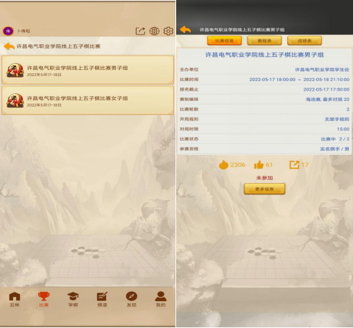 为充分发挥智力体育项目在疫情常态化下的积极作用,丰富学生在疫情防控期间的课余文化生活,促进五子棋项目在我院中的广泛开展,在严格遵守防疫规定要求下,2022年5月17日-18日我院举办了首届线上五子棋比赛。