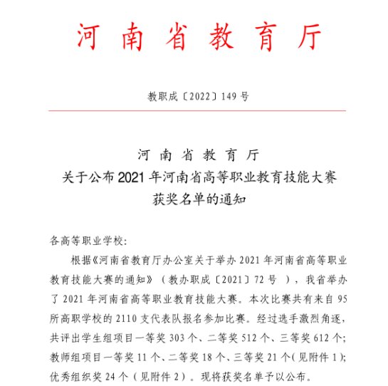 近日,从《河南省教育厅关于公布2021年河南省高等职业教育技能大赛获奖名单的通知》(教职成〔2022〕149号)中获悉,在2021年河南省高等职业教育技能大赛中我院派出的32支参赛队,经过参赛选手的激烈角逐,荣获一等奖2项、二等奖9项、三等奖10项。