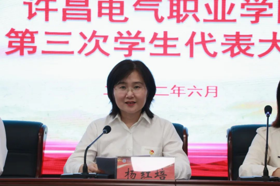 杨红培在讲话中充分肯定了学生会过去一年的工作。她指出,今年是党的二十大召开之年,也是共青团成立100周年,此时召开学代会意义重大,希望广大学生代表带头做政治坚定、思想进步的表率。杨红培向新一届学生会主席团提出了三点希望:要把握正确政治方向,将青年学生团结凝聚在党的周围;要坚持服务同学宗旨,将促进学生成长成才作为首要工作任务;要继续深化学生会改革,培育清新阳光的组织文化。
